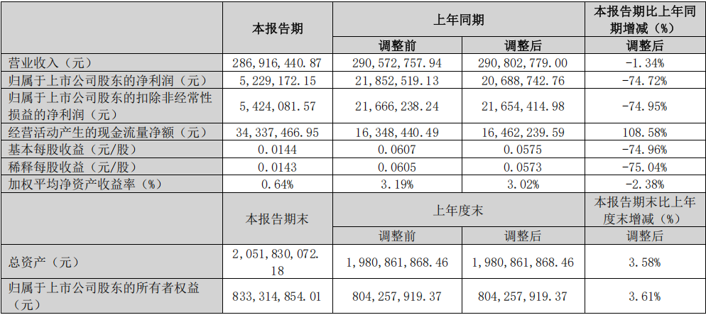 截至报告期末,公司总资产为205,183.01万元,较上年末增长3.58%;归属于上市公司股东的所有者权益为83,331.49万元,较上年末增长3.61%。基本每股收益为0.0144元,加权平均净资产收益率为0.64%。