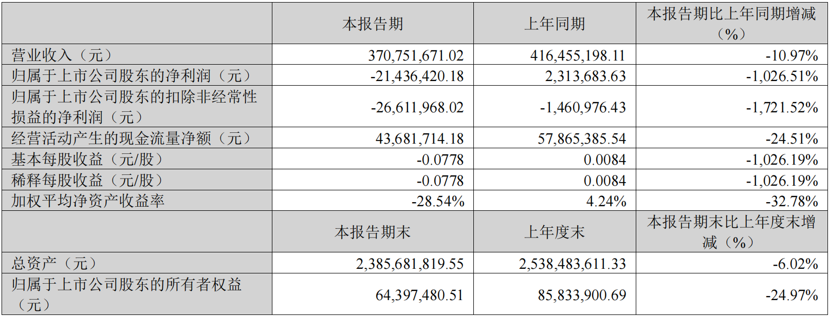 报告期内,公司实现归属于上市公司股东的扣除非经常性损益的净利润-2661.20万元,较上年同期亏损146.10万元扩大1721.52%。公司加权平均净资产收益率为-28.54%,较上年同期的4.24%下降32.78个百分点。基本每股收益为-0.0778元,同比下降1026.19%。