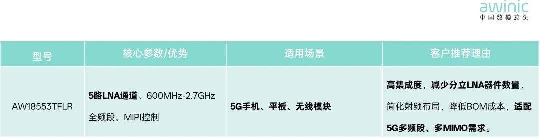 关键细节:AW18553TFLR通过MIPI RFFE协议控制,可动态切换5路LNA通道,灵活适配不同频段与MIMO需求,大幅简化5G射频前端设计,降低客户研发周期。