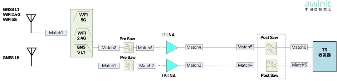 信号链路:ANT(天线)→ Pre SAW(前置声表面波滤波器)→ GNSS LNA → Post SAW(后置声表面波滤波器)→ TR(收发器)