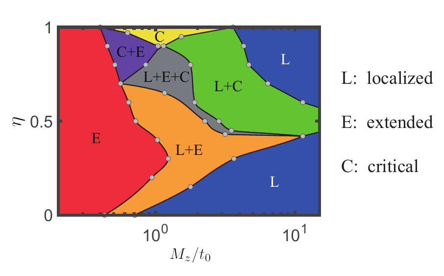 Anderson局域化是凝聚态物理中的基本现象。针对传统无序系统,非线性sigma模型已提供普适的理论框架,但准周期系统中局域化转变的理论框架至今仍未建立。相比完全随机的无序系统,具有确定性但不具平移周期性的准周期系统物理更为丰富:扩展态、局域态、临界态这3类量子态不仅各自可构成纯相,还能两两或三者共存,共形成7种基本局域化相。其中临界态因独特的多分形结构和奇异动力学行为而备受关注,刘雄军团队此前在该方向做出一系列原创工作,相关成果发表于Phys. Rev. Lett.、Nature Physics等期刊。但此前尚无能同时承载所有这7种相、尤其是精确可解的统一模型。