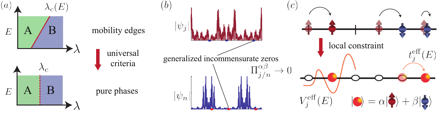 在此框架下,团队基于重整化技术、对偶方法和Avila全局理论证明了3个核心普适结果(图1):当系统保持(类)手征对称性时,迁移率边消失、系统只存在纯相,由此揭示了纯相与共存相的对称性起源;自旋系统中临界态可由“广义非公度矩阵元零点”(GIZs)这一全新机制产生,相比无自旋系统极大拓展了实现临界态的途径;当跃迁耦合矩阵行列式为零时,系统可约化为等效无自旋准周期链并被精确求解,由此给出了构造可解模型的系统化条件。